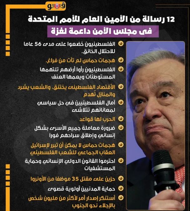 خلال الأيام القليلة السابقة، تعرض الأمين العام للأمم المتحدة، أنطونيو جوتيريش، لهجوم حاد من إسرائيل وعدد من الدول الغربية، وصل للمطالبة بالاستقالة من منصبه، على خلفية كلامه المؤيد لحقوق فلسطين وشعبها، بعدما أسقط ورقة التوت عن إسرائيل والغرب أمام شعوب العالم.