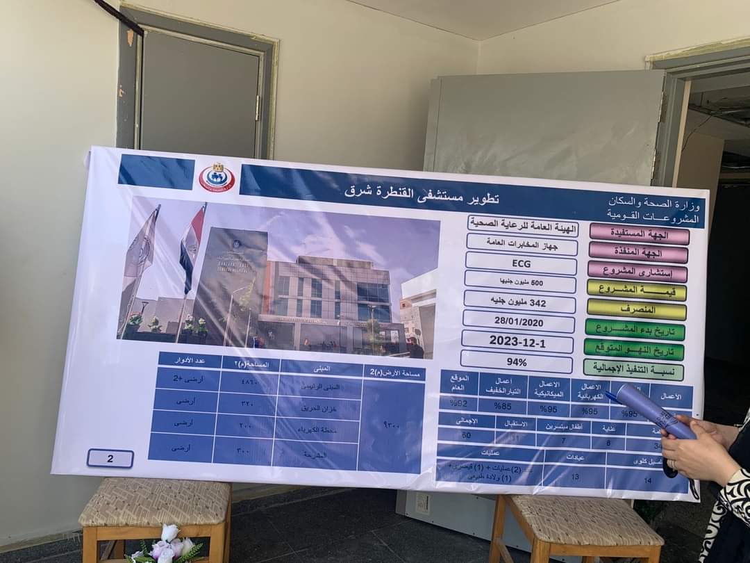 تفقد وفد من وزارة الصحة، مستشفي القنطرة شرق في محافظة الإسماعيلية وذلك لمتابعة أعمال التطوير في المستشفى والاعمال الإنشائية وذلك تمهيدا لبدء التشغيل التجريبي للمستشفى خلال أيام وانضمامها لمنظومة التأمين الصحي الشامل.