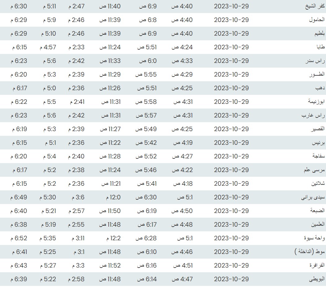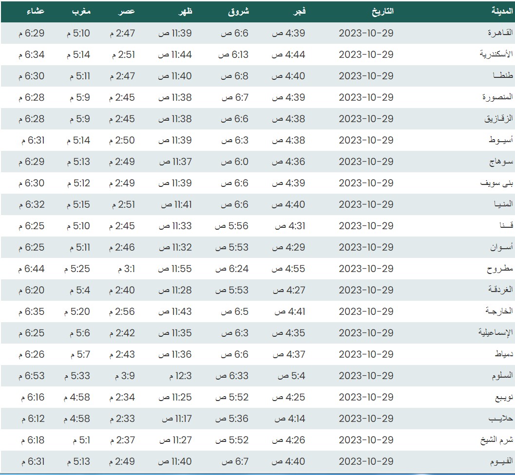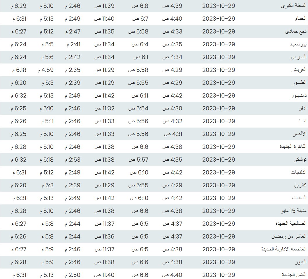 مواقيت الصلاة اليوم وفقًا للتوقيت المحلي لمدينتي القاهرة والإسكندرية وكذلك،مواقيت الصلاة، لعدد من مدن ومحافظات الجمهورية من واقع بيانات الهيئة العامة للمساحة