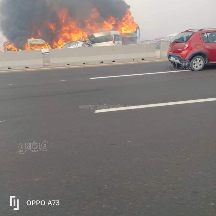 والتهمت النيران 6 سيارات من بينهم أتوبيس و3 سيارات ملاكى وسيارة نقل ثقيل ويقوم رجال المرور بسحب الكثافات المرورية على طريق اسكندرية الصحراوى لتيسير حركة المركبات.
