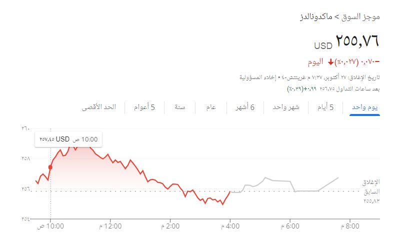 شهدت جلسة التداول على السهم تراجع أسهم ماكدونالدز، مع انخفاض ملحوظ بنسبة 0.85٪ وانخفضت قيمة السهم من 259.54 دولارًا إلى 255.83 دولارًا بنهاية يوم التداول، علاوة على ذلك، بلغ معدل التراجع السنوي لأسهم ماكدونالدز عبر البورصات العالمية ما يقارب 0.3%.
