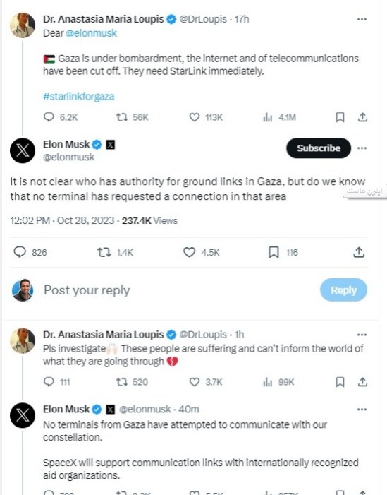 وكانت طبيبة دنماركية تعرف بـ Dr. Anastasia Maria Loupis، نشرت تغريدة قالت فيها "غزة تتعرض للقصف، والإنترنت والاتصالات مقطوعة.. إنهم بحاجة إلى StarLink على الفور" وأشارت إلى "ماسك" في تغريدتها.