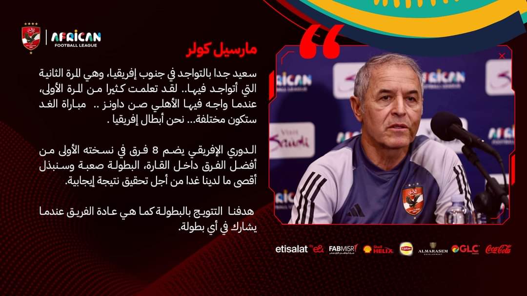تحدثق مارسيل كولر المدير الفني للفريق الأول لكرة القدم بالنادي الأهلي في تصريحات بالمؤتمر الصحفي لمباراة فريقه أمام ماميلودي صن داونز في ذهب نصف نهائي دوري السوير الأفريقي.