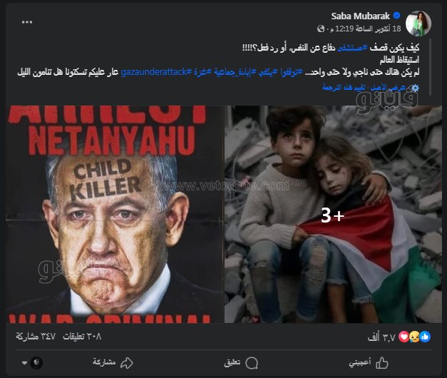 وفي منشور آخر: سألت صبا جمهورها ومتابعيها في كل مكان عبر “فيس بوك”: كيف يمكن قصف مستشفى.. متى يستيقظ العالم.. توقفوا يكفي إبادة جماعية في غزة.. عار عليكم تسكتونا هل تنامون الليل.