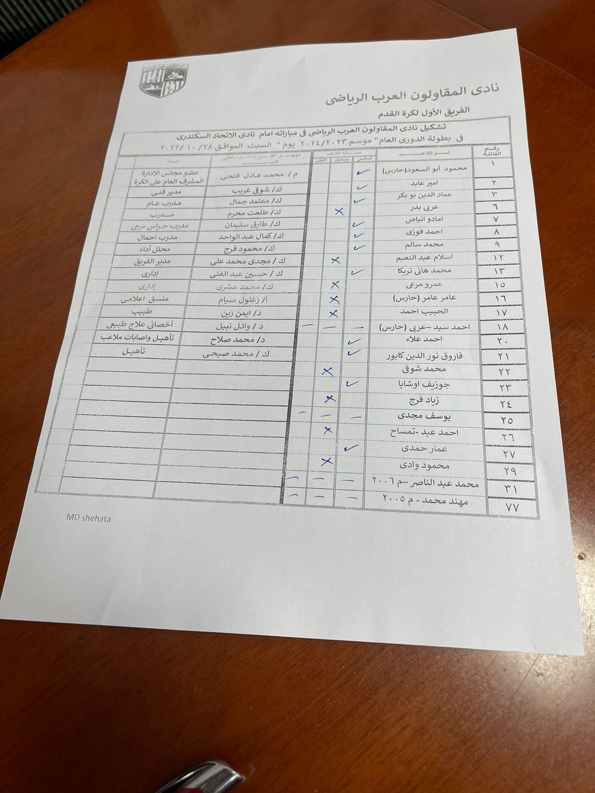 وكان شوقي غريب المدير الفني لفريق المقاولون العرب، أعلن تشكيل فريقه لمواجهة نظيره الاتحاد السكندري، ضمن مباريات الجولة الخامسة لمسابقة الدوري المصري الممتاز موسم 2023-2024.