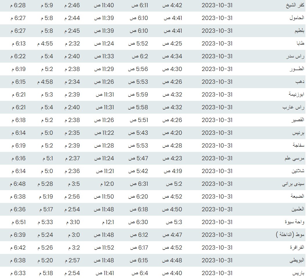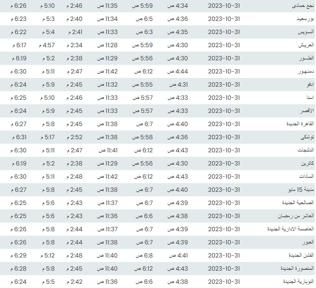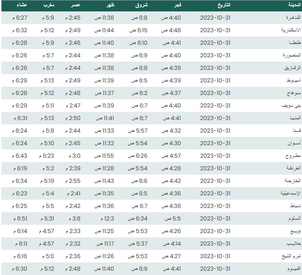 مواقيت الصلاة اليوم وفقًا للتوقيت المحلي لمدينتي القاهرة والإسكندرية وكذلك،مواقيت الصلاة، لعدد من مدن ومحافظات الجمهورية من واقع بيانات الهيئة العامة للمساحة
