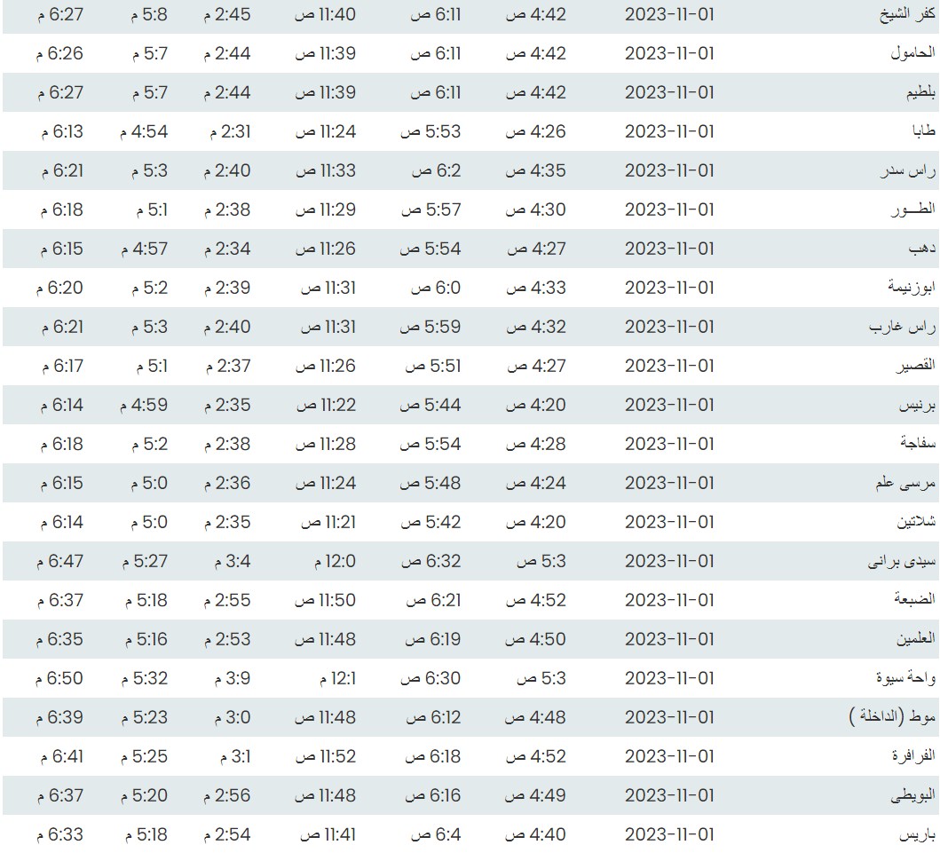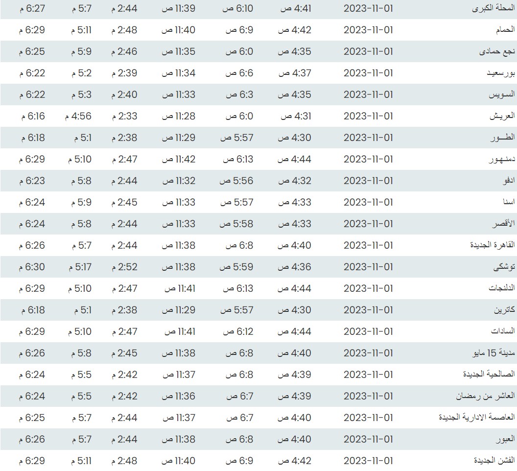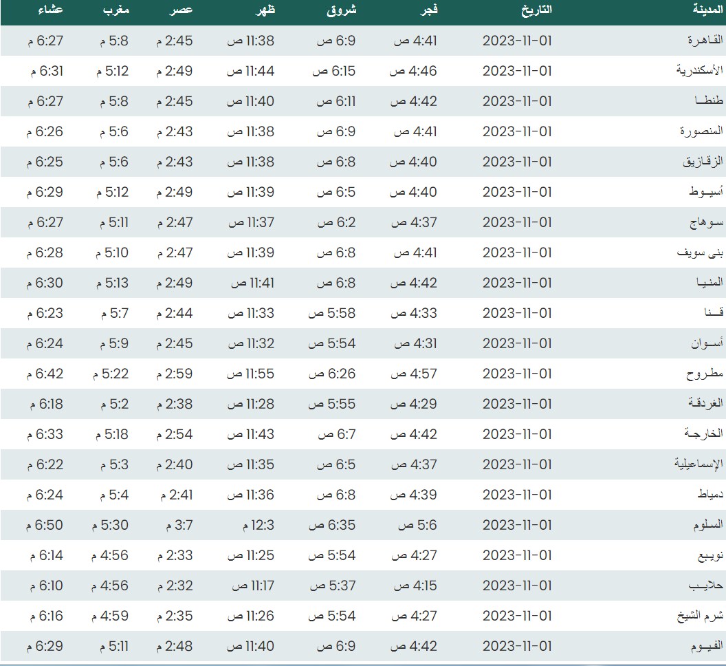 مواقيت الصلاة اليوم وفقًا للتوقيت المحلي لمدينتي القاهرة والإسكندرية وكذلك،مواقيت الصلاة، لعدد من مدن ومحافظات الجمهورية من واقع بيانات الهيئة العامة للمساحة