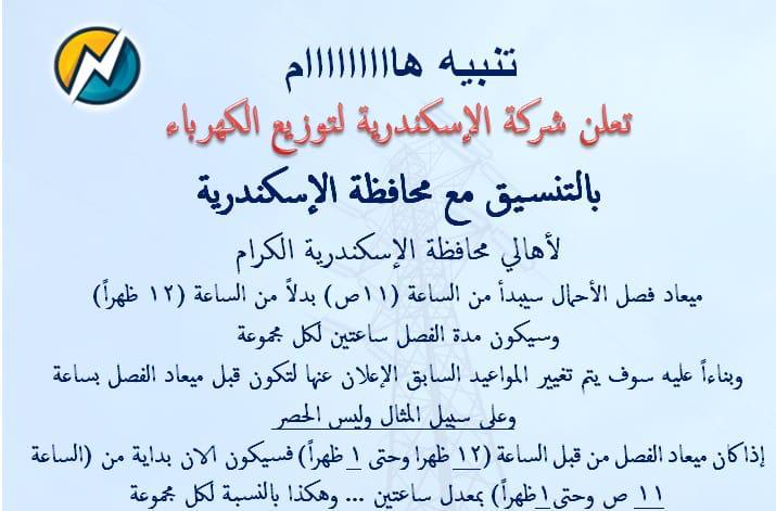 أعلنت منذ قليل، شركة الإسكندرية لتوزيع الكهرباء عن تعديل موعد انقطاع التيار الكهربائي في المدينة وتقديمها لمدة ساعة وزيادة مدة القطع لتصبح ساعتين بدلا من ساعة واحدة، بعد قطعه أمس واليوم مرتين كل مدة بلغت ساعتان ليصبح إجمالي قطع التيار الكهربائي ٤ ساعات.