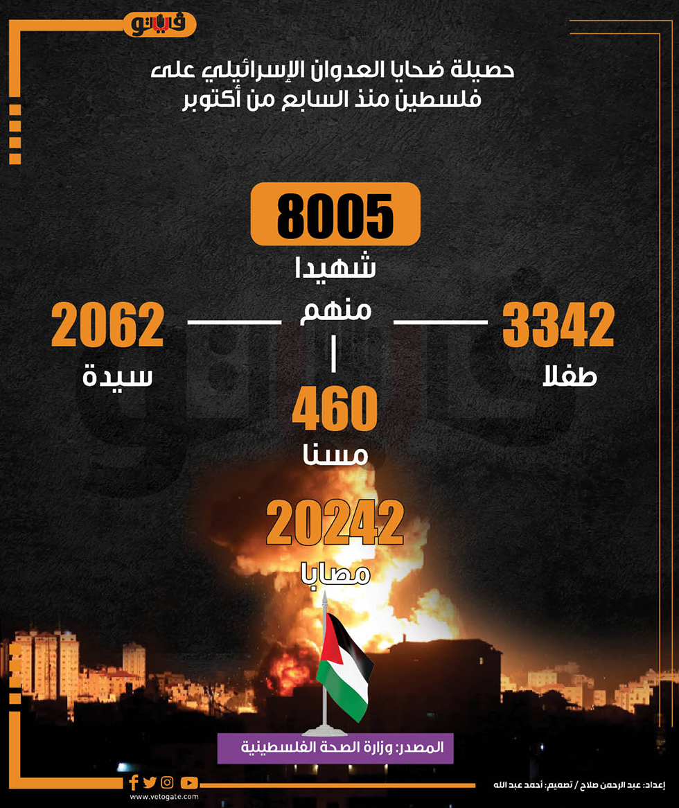 حصيلة ضحايا العدوان الإسرائيلي على فلسطين منذ السابع من أكتوبر (إنفوجراف) الأحد 29/أكتوبر/2023 - 10:40 م 10/29/2023 10:40:55 PM قطاع غزة، فيتو عبدالرحمن صلاح شارك طباعة 18 حجم الخط شارك طباعة طوفان الأقصى عملية طوفان الأقصى قطاع غزة غزة الان الاحتلال الإسرائيلي فلسطين احداث فلسطين