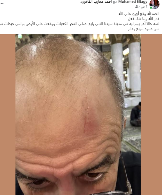 ونشر محمد التاجي صورة له وعلق عليها قائلا: "الحمد لله وقع أجري على الله، قدر الله وما شاء فعل، لسه حالًا آخر يوم ليا في مدينة سيدنا النبي، رايح أصلي الفجر، تكعبلت ووقعت على الأرض، وراسي خبطت في سن عمود مربع رخام".