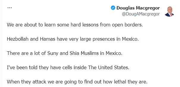 وقال دوجلاس ماكجريجور: "نحن على وشك تعلم بعض الدروس الصعبة من الحدود المفتوحة. ولحزب الله وحماس حضور كبير للغاية في المكسيك. هناك الكثير من المسلمين الشيعة والسنة في المكسيك. لقد قيل لي أن لديهم خلايا داخل الولايات المتحدة. عندما يهاجمون سنكتشف مدى فتكهم."