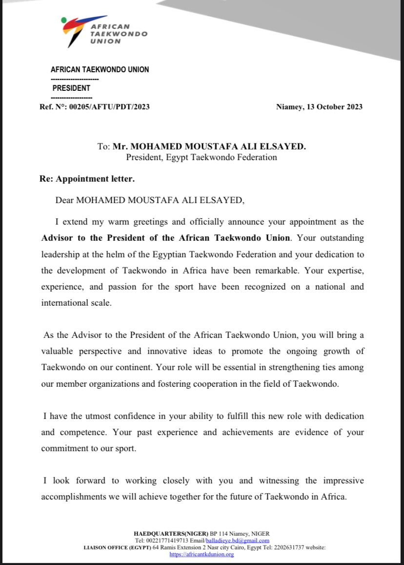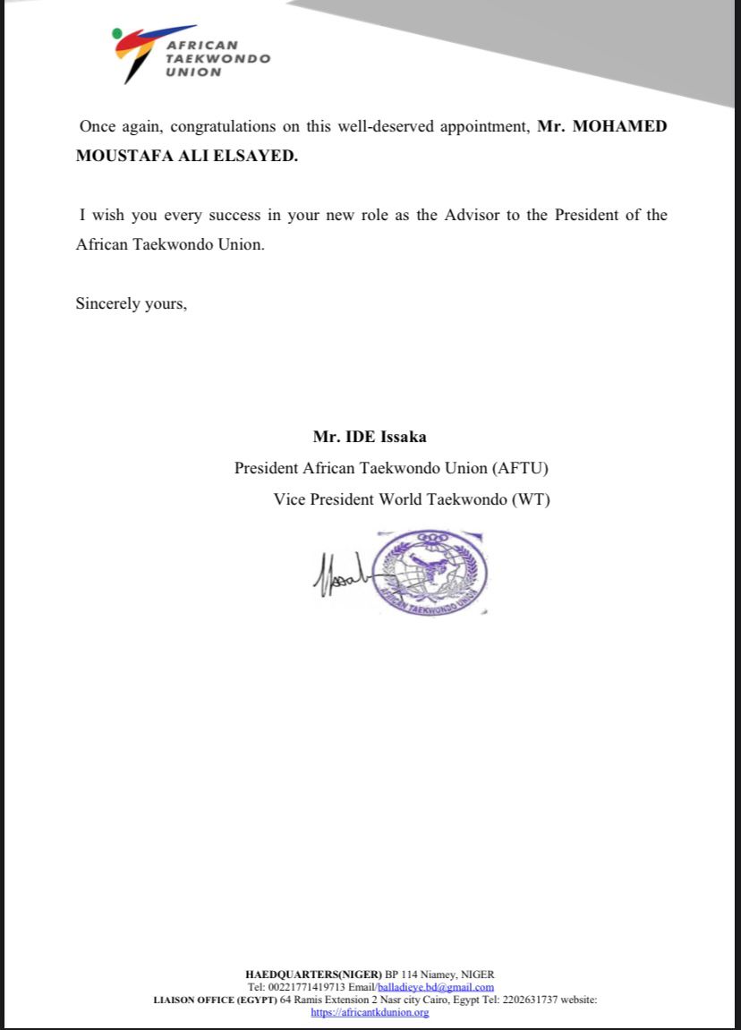 وأرسل الاتحاد الإفريقي برئاسة ايدي ايزاكا خطابا جاء مضمونه ان اختيار المستشار محمد مصطفى كمستشار لرئيس الاتحاد الافريقي للتايكوندو يرجع الى قيادته المتميزة للاتحاد المصري للتايكوندو والتى اتسمت بالخبرة والتفاني والكفاءة على المستويين الوطني والدولي مما يجعل شغله لهذا المنصب المستحق وسط مجتمع التايكوندو الافريقي دورا هاما فى تعزيز ودعم التايكوندو فى القارة الافريقية بافكار مبتكرة من شأنها توطيد العلاقات والتعاون بين الاتحادات الوطنية اعضاء الاتحاد الافريقي للتايكوندو.