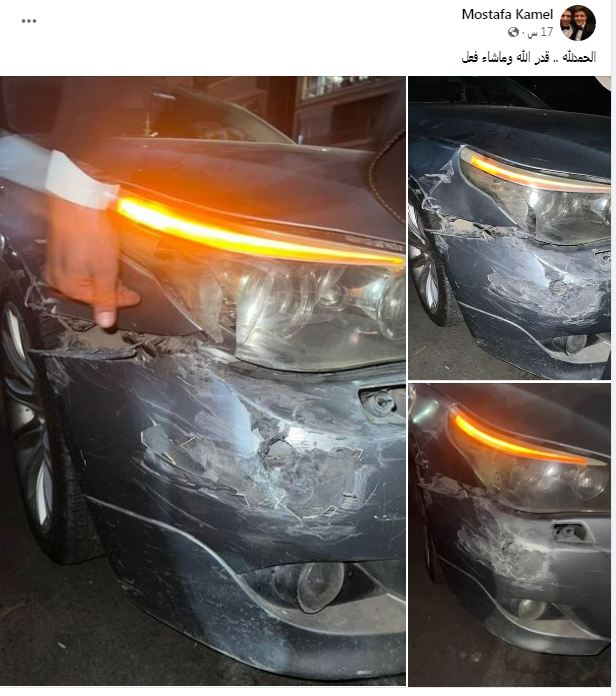 ونشر مصطفى كامل مجموعة من الصور لتحطم سيارته، وعلق عليها قائلا: "الحمد لله.. قدر الله وما شاء فعل".