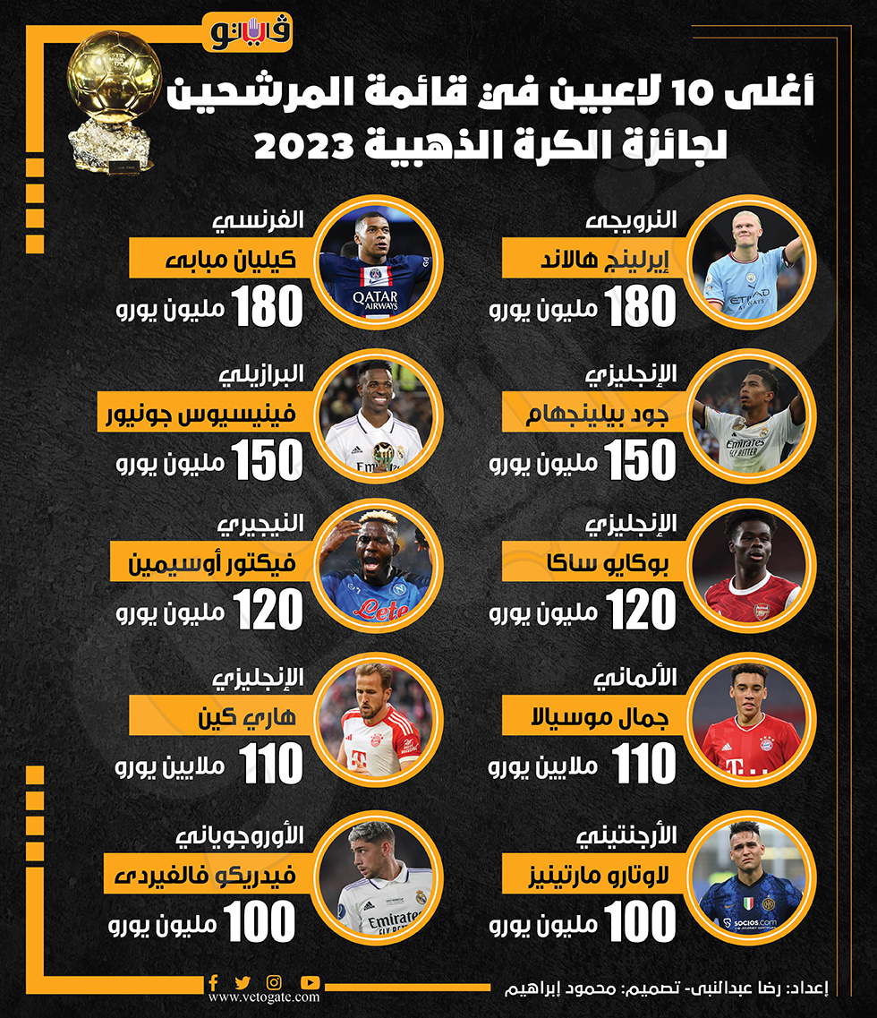 أغلى 10 لاعبين في قائمة المرشحين لجائزة الكرة الذهبية 2023 (إنفوجراف) الإثنين 30/أكتوبر/2023 - 07:38 م 10/30/2023 7:38:31 PM الكرة الذهبية، فيتو رضا عبدالنبى شارك طباعة 18 حجم الخط شارك طباعة