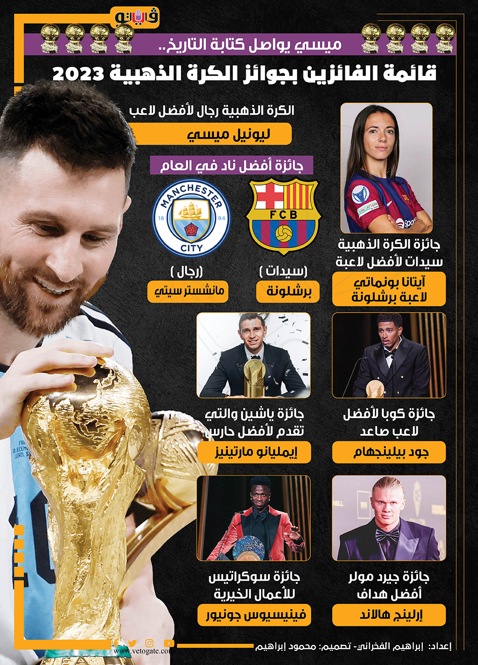 ميسي يواصل كتابة التاريخ.. قائمة الفائزين بجوائز الكرة الذهبية 2023 (إنفوجراف) الإثنين 30/أكتوبر/2023 - 11:45 م 10/30/2023 11:45:33 PM الكرة الذهبية، فيتو إبراهيم الفخراني شارك طباعة 18 حجم الخط شارك طباعة الكرة الذهبية ليونيل ميسي جائزة الكرة الذهبية سيدات جود بيلينجهام جائزة ياشين