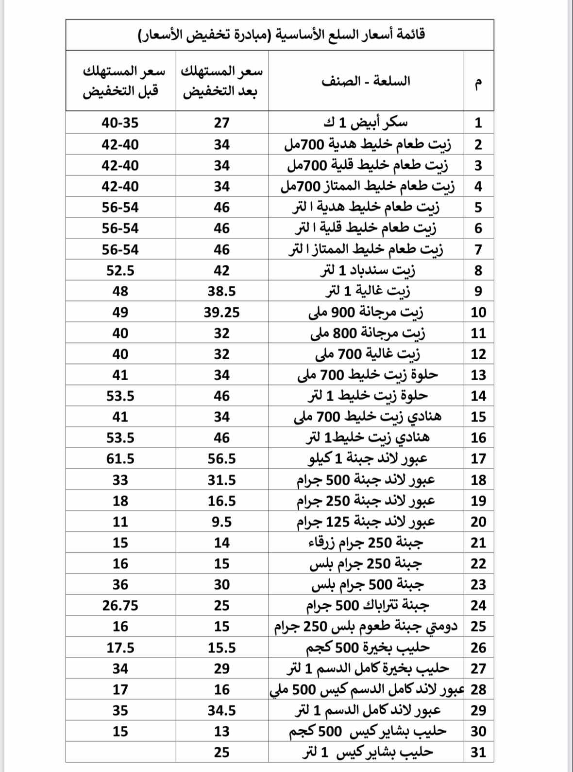 وجاءت قائمة أنواع السلع وأسعارها قبل وبعد التخفيض علي النحو التالي: