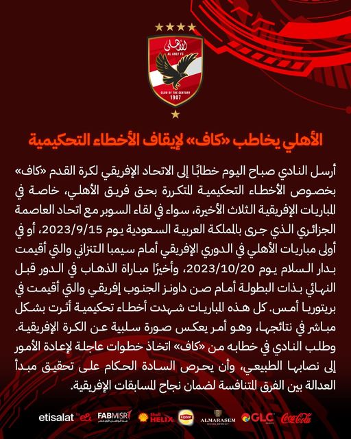 أرسل النادي الأهلي صباح اليوم خطابا رسميا إلى الاتحاد الأفريقي "كاف" بخصوص الأخطاء التحكيمية المتكررة بحق فريق الأهلي، خاصة في المباريات الأفريقية، سواء في لقاء السوبر أمام اتحاد العاصمة وكذلك مواجهة سيمبا بذهاب ربع نهائي الدوري الأفريقي وكذلك مواجهة صن داونز الجنوب افريقي في ذهاب الدوري الأفريقي.