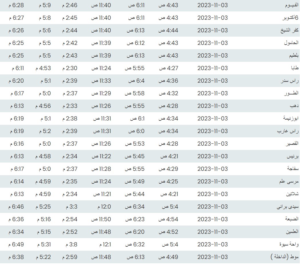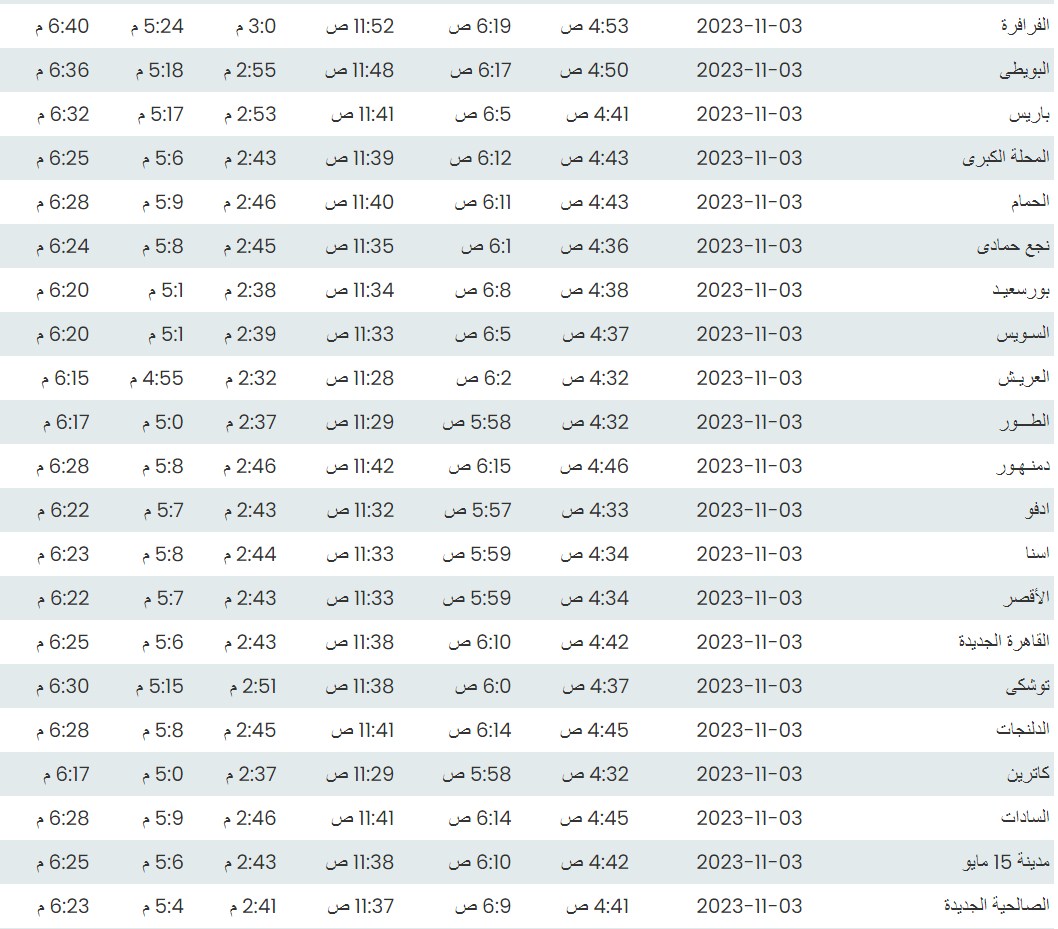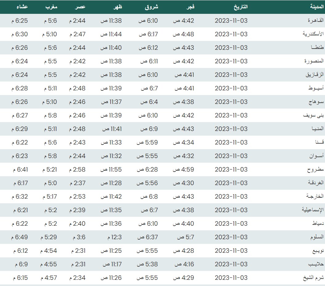 مواقيت الصلاة اليوم وفقًا للتوقيت المحلي لمدينتي القاهرة والإسكندرية وكذلك،مواقيت الصلاة، لعدد من مدن ومحافظات الجمهورية من واقع بيانات الهيئة العامة للمساحة
