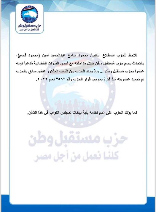 وتابع البيان: النائب المذكور عضو مفصول من مستقبل وطن بموجب قرار الحزب رقم 56 لسنة 2022.