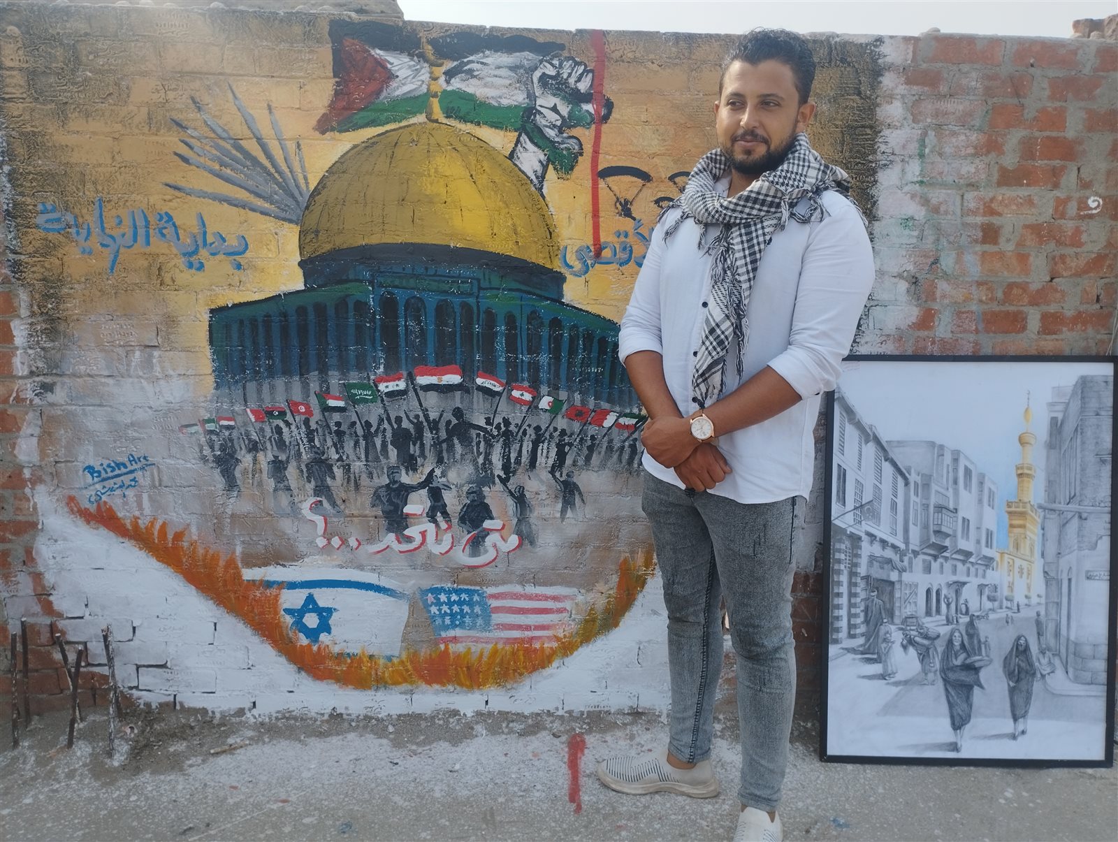 دعمًا للقضية الفلسطينية، محمد البشبيشي يرسم جرافيتي لقبة الصخرة على حائط منزله (صور)
