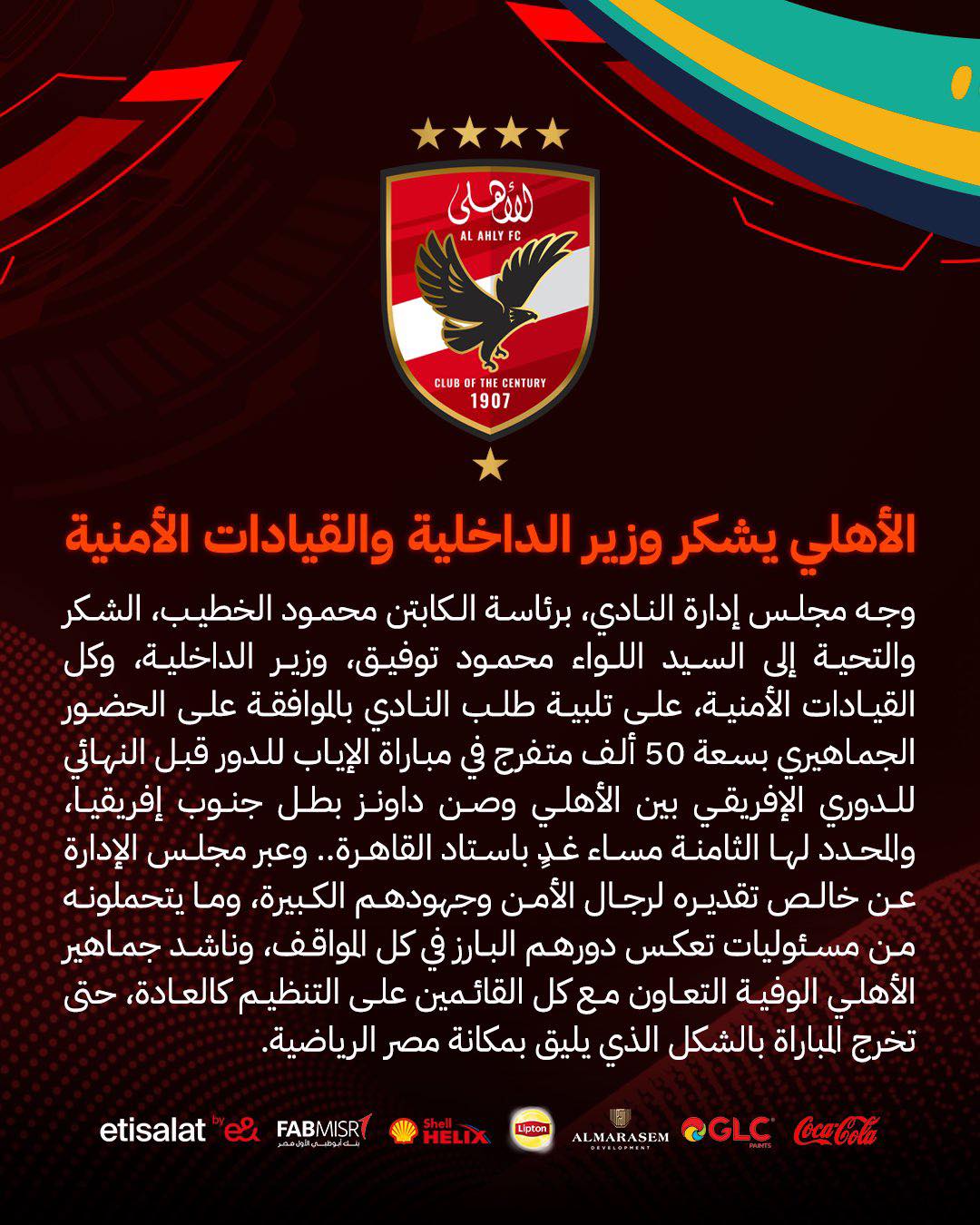 وجه مجلس إدارة النادي الأهلي برئاسة محمود الخطيب الشكر والتحية الي اللواء محمود توفيق وزير الداخلية والقيادات الأمنية بعد الموافقة على الحضور الجماهيري بسعة 50 ألف متفرج في إستاد القاهرة.