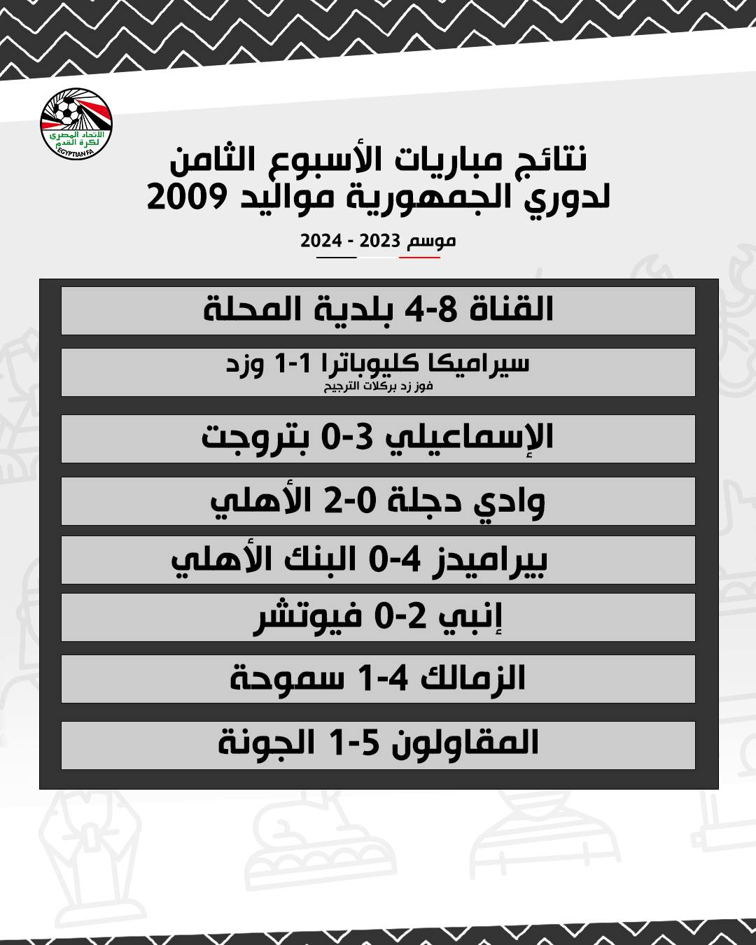 دوري الجمهورية للناشئين، يتصدر فريق إنبي قمة جدول ترتيب دوري الجمهورية للناشئين مواليد 2009 بعد انتهاء الجولة الثامنة.