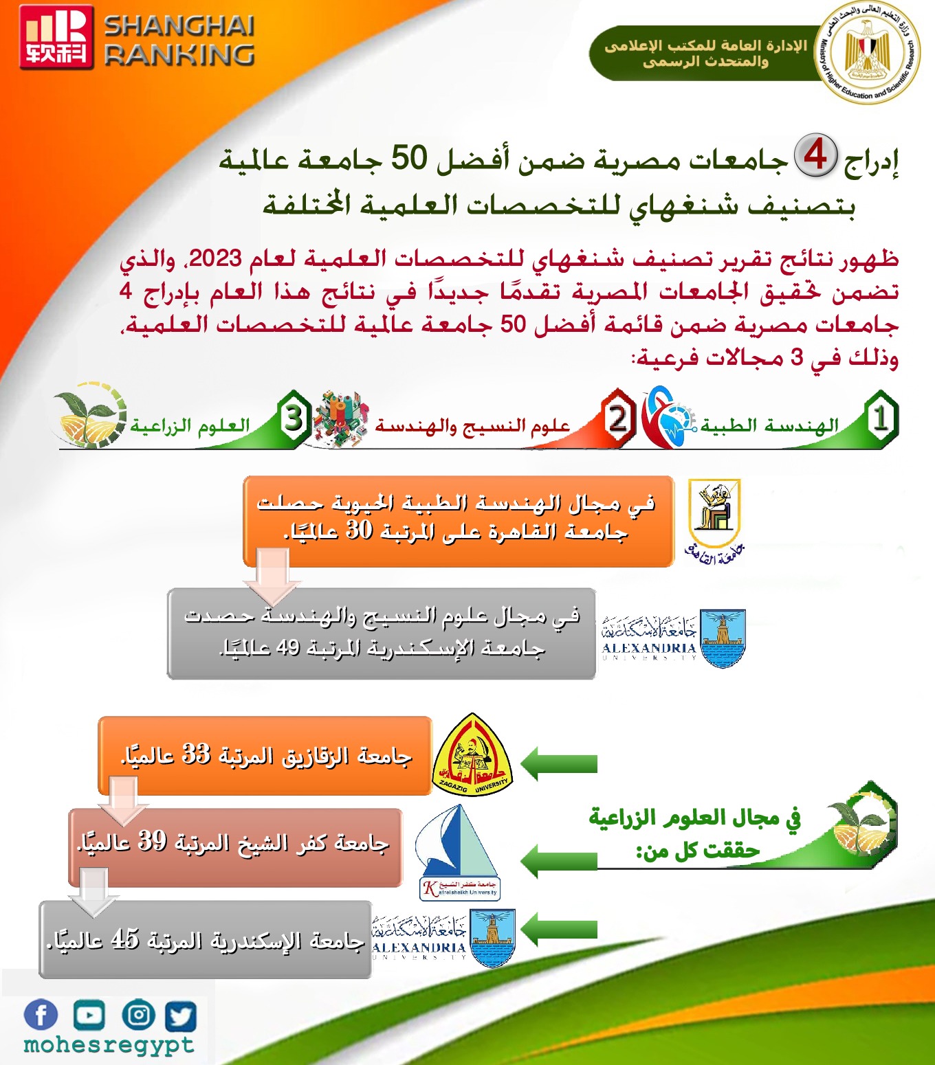 وأشار الوزير إلى ظهور نتائج تقرير تصنيف شنغهاي للتخصصات العلمية لعام 2023، والذي تضمن تحقيق الجامعات المصرية تقدمًا جديدًا في نتائج هذا العام بإدراج 4 جامعات مصرية ضمن قائمة أفضل 50 جامعة عالمية للتخصصات العلمية، وذلك في 3 مجالات فرعية، وهي (الهندسة الطبية، وعلوم النسيج، والعلوم الزراعية)، وبيانها كالآتي: