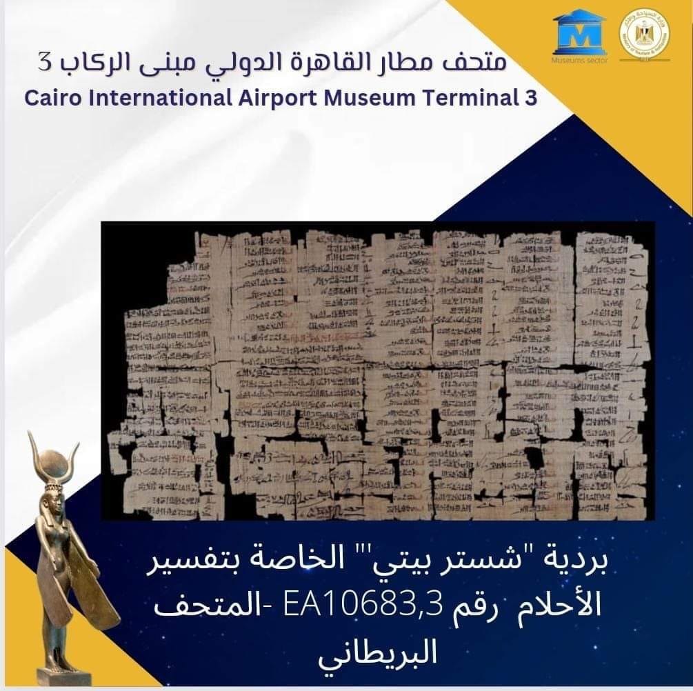 عرضت الصفحة الرسمية لمتحف مطار القاهرة الدولي بمبنى الركاب رقم 3، سرد لبداية ظهور كتب الاحلام في عصر الدولة الوسطي والحديثة والتي انتشرت في العصر المتأخر، وأهمية احلام النوم عند المصريين القدماء.