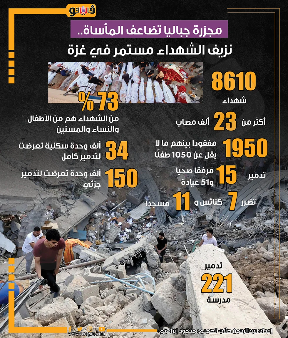 الهلال الأحمر الفلسطينى بغزة قال إن هناك 12 مستشفى خرج من الخدمة بسبب نقص الوقود كما تتحول المستشفيات إلى مقابر فيما تعرضت العشرات من سيارات الإسعاف للقصف، وأوضح أن هناك 21 ألف إصابة بالإضافة إلى مليون و400 ألف نازح بسبب القصف الإسرائيلى.