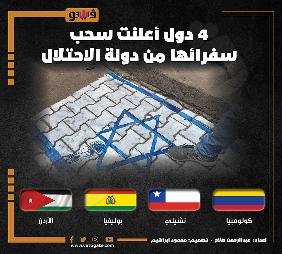 4 دول أعلنت سحب سفرائها من دولة الاحتلال (إنفوجراف) السبت 04/نوفمبر/2023 - 10:12 ص 11/4/2023 10:12:27 AM دول سحبت سفرائها من إسرائيل، فيتو عبدالرحمن صلاح شارك طباعة 18 حجم الخط شارك طباعة إسرائيل دولة الإحتلال كولومبيا تشيلي بوليفيا