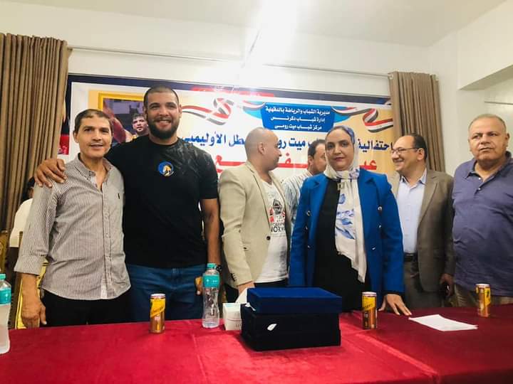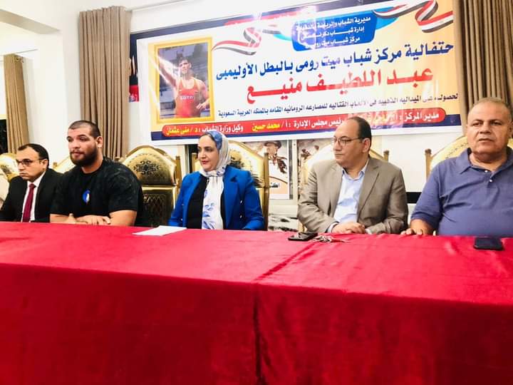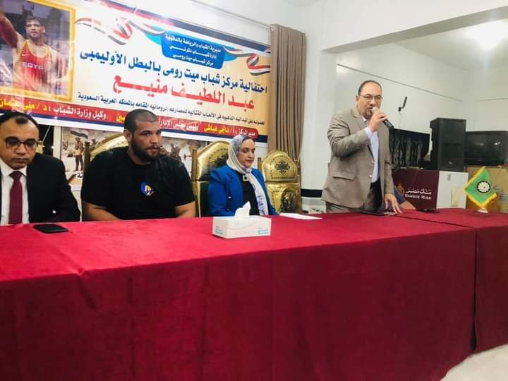كرمت الدكتورة منى عثمان وكيل وزارة الشباب والرياضة بالدقهلية، البطل المصري عبد اللطيف منيع لاعب المنتخب الوطني للمصارعة، خلال الاحتفالية المقامة بمركز شباب ميت رومى التابع لإدارة شباب دكرنس.