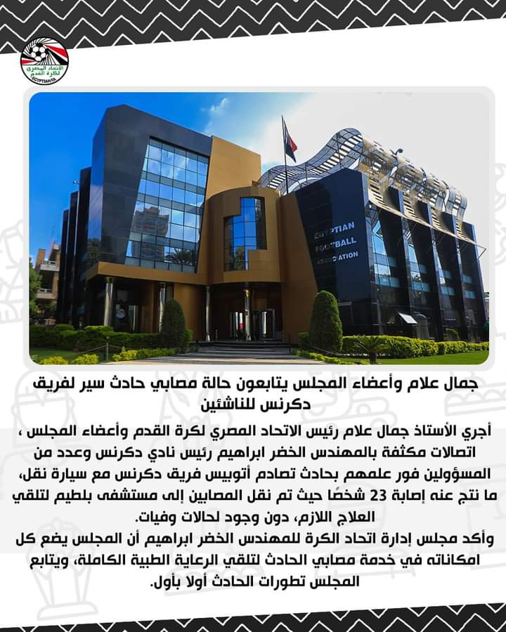 اتحاد الكرة، أجرى جمال علام رئيس الاتحاد المصري لكرة القدم وأعضاء المجلس، اتصالات مكثفة بالمهندس الخضر إبراهيم رئيس نادي دكرنس وعدد من المسؤولين فور علمهم بحادث تصادم أتوبيس فريق دكرنس للناشئين مع سيارة نقل، ما نتج عنه إصابة 23 شخصًا حيث تم نقل المصابين إلى مستشفى بلطيم لتلقي العلاج اللازم، دون وجود لحالات وفيات.