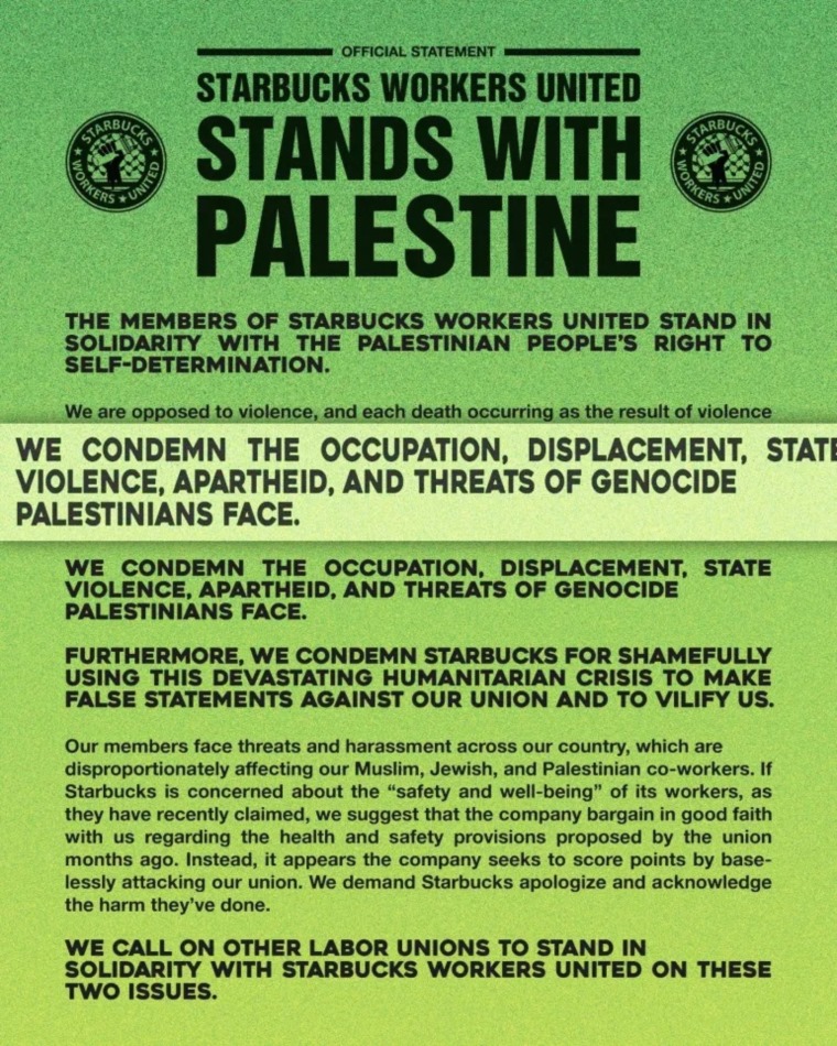 منذ الأيام الأولى للقصف الإسرائيلي على قطاع غزة في السابع من أكتوبر الجاري، الذي جاء ردًا على عملية طوفان الأقصى، أعلنت نقابة عمال ستاربكس وقوفها إلى جانب الشعب الفلسطيني، وذلك وفقًا لمبادئ النقابة الداعمة للحقوق والحريات.