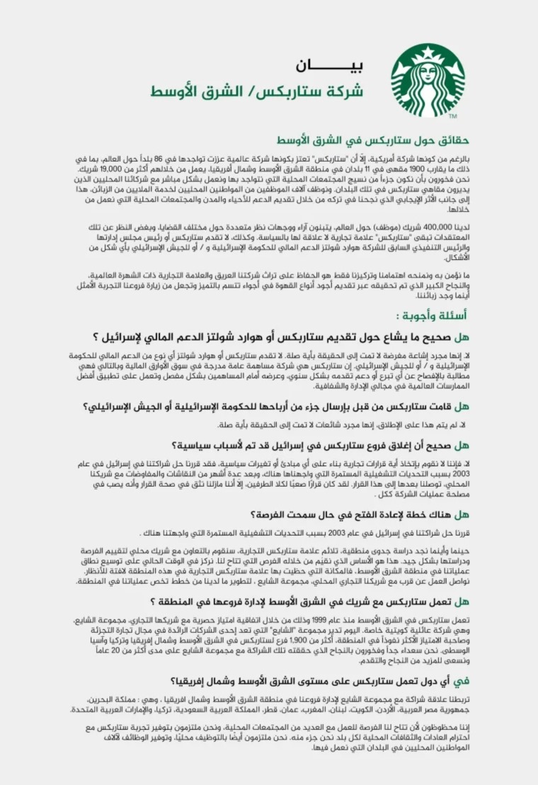وردا حملات المقاطعة في دول عربية عدة، أصدرت ستاربكس في المنطقة بيانًا علّقت فيه حول قضية دعهما لجيش الاحتلال الإسرائيلي أو للحكومة الإسرائيلية بالقول، إنها "مجرد شائعة مغرضة لا تمت إلى الحقيقة بأي صلة.. لا تقدم ستاربكس، أي نوع من الدعم المالي للحكومة الإسرائيلية، أو للجيش الإسرائيلي".