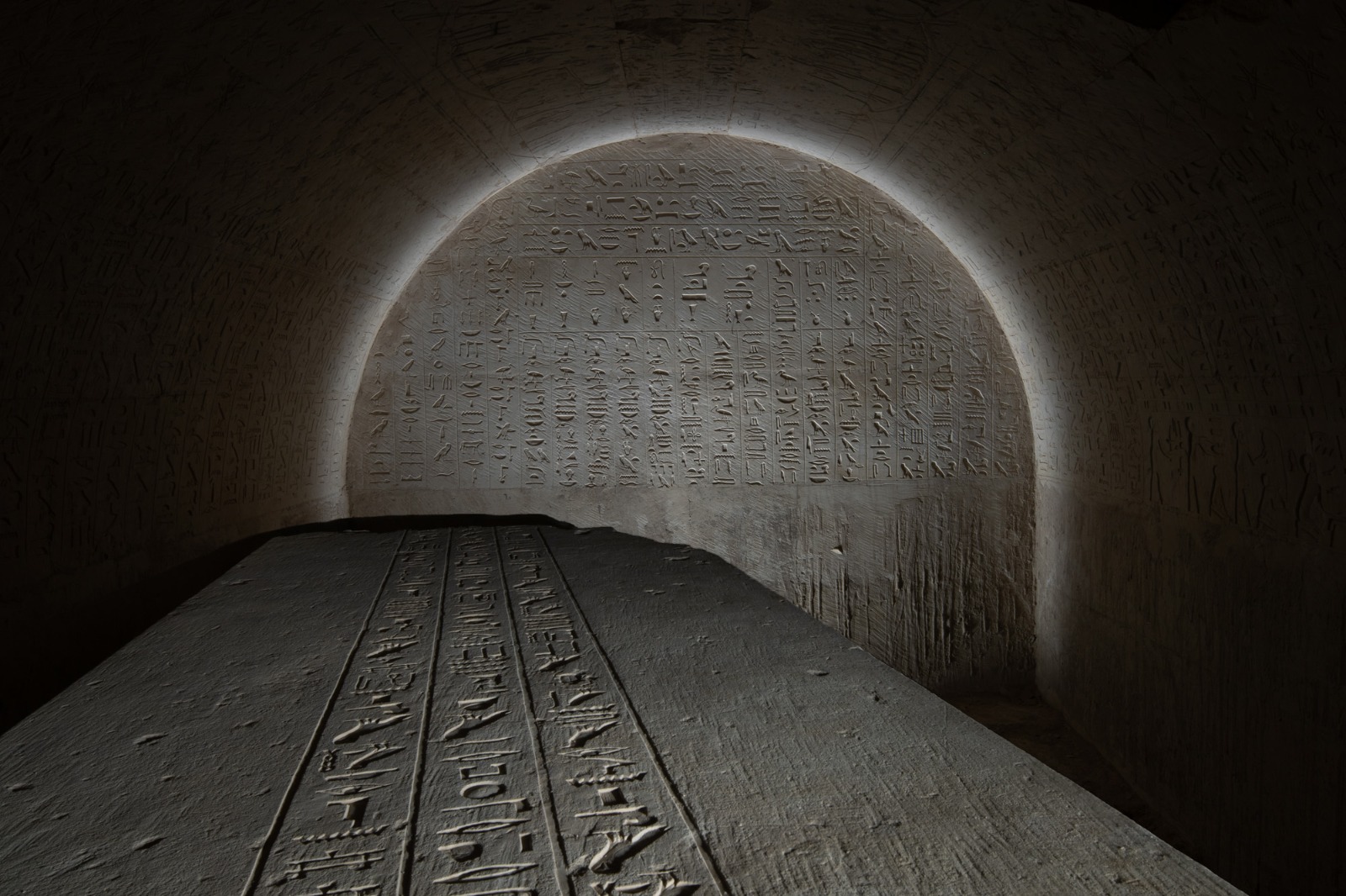 وأشار الدكتور محمد مجاهد نائب مدير البعثة التشيكية الى أن البعثة عثرت أثناء أعمالها داخل حجرة الدفن على التابوت الخاص بالمتوفى وأنه مصنوع من الحجر ومزين بنصوص هيروغليفية وتصوير للآلهة من الخارج والداخل، أما الجانب العلوي من غطاء التابوت والجوانب الأطول له فمزينة بنصوص مختلفة من كتاب الموتى، بما في ذلك صور الآلهة التي تحمي المتوفى. وتحمل الجوانب الأقصر للغطاء صور للإلهتين "إيزيس ونفتيس"مصحوبة بنصوص الحماية للمتوفى.