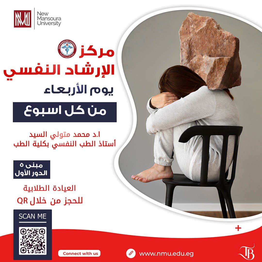 يستمر مركز الإرشاد النفسي برئاسة الدكتور محمد متولي السيد - أستاذ الطب النفسي بكلية الطب جامعة المنصورة الجديدة في تقديم خدماته لطلاب الجامعة يوم الأربعاء من كل أسبوع بالعيادة الطبية بمبنى ( 5 ) الدور الأول