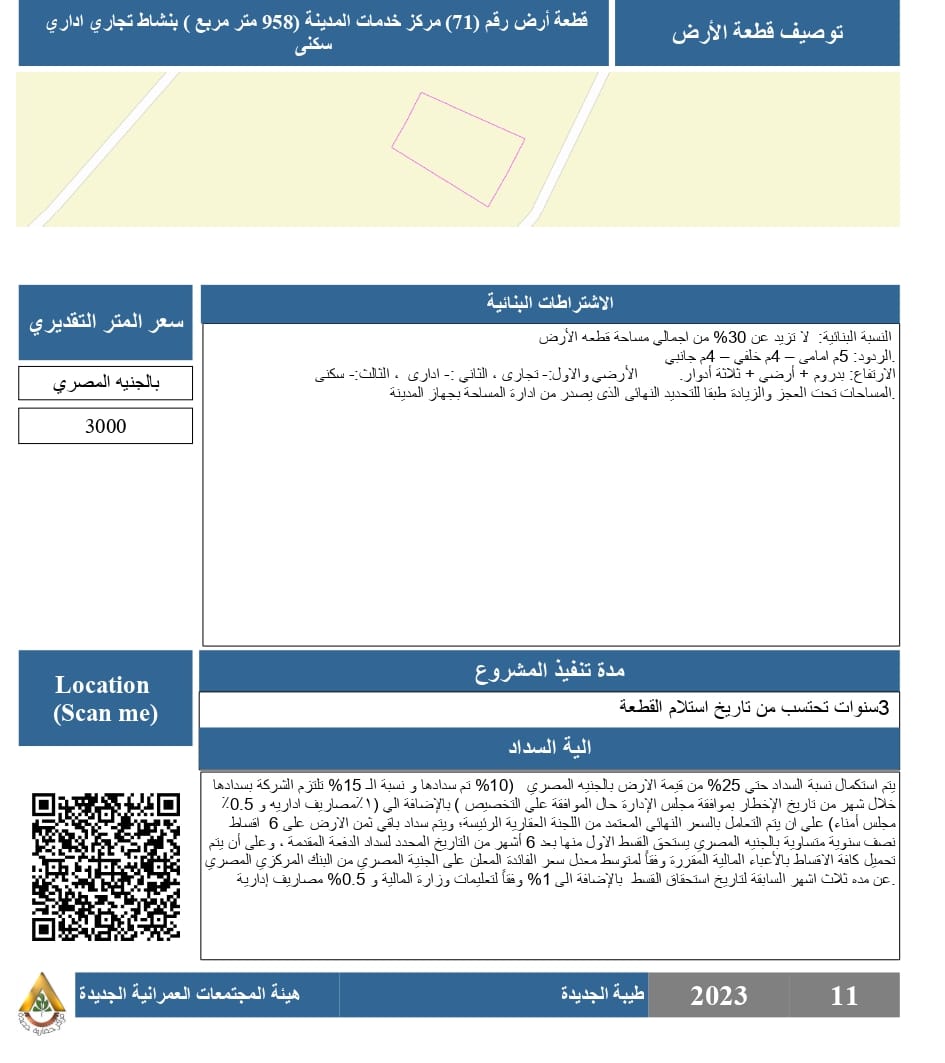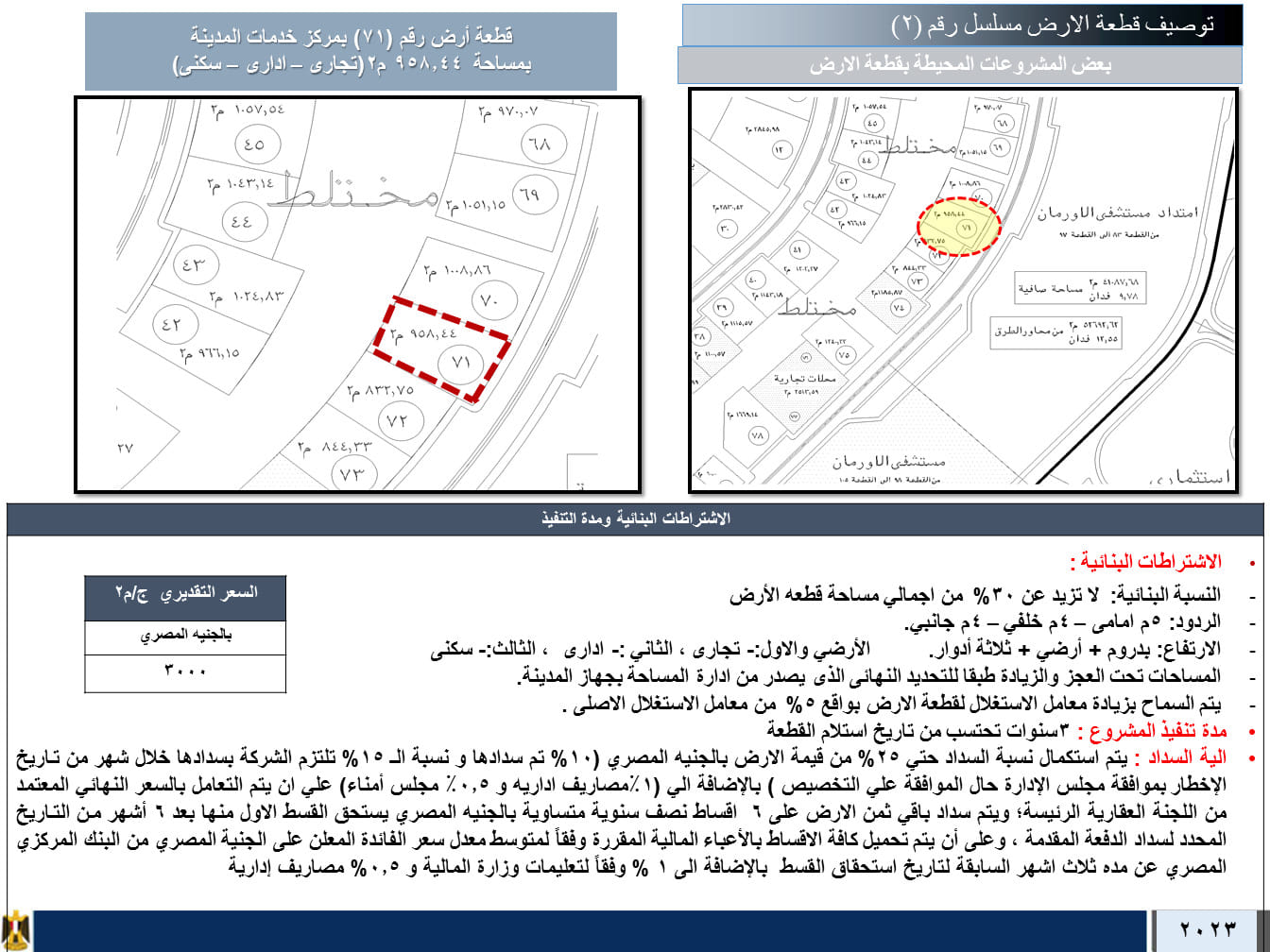 ٢- قطعة أرض رقم (٧١) بنشاط "تجاري إداري سكني" بمساحة ٩٥٨ م٢ بمركز خدمات المدينة.