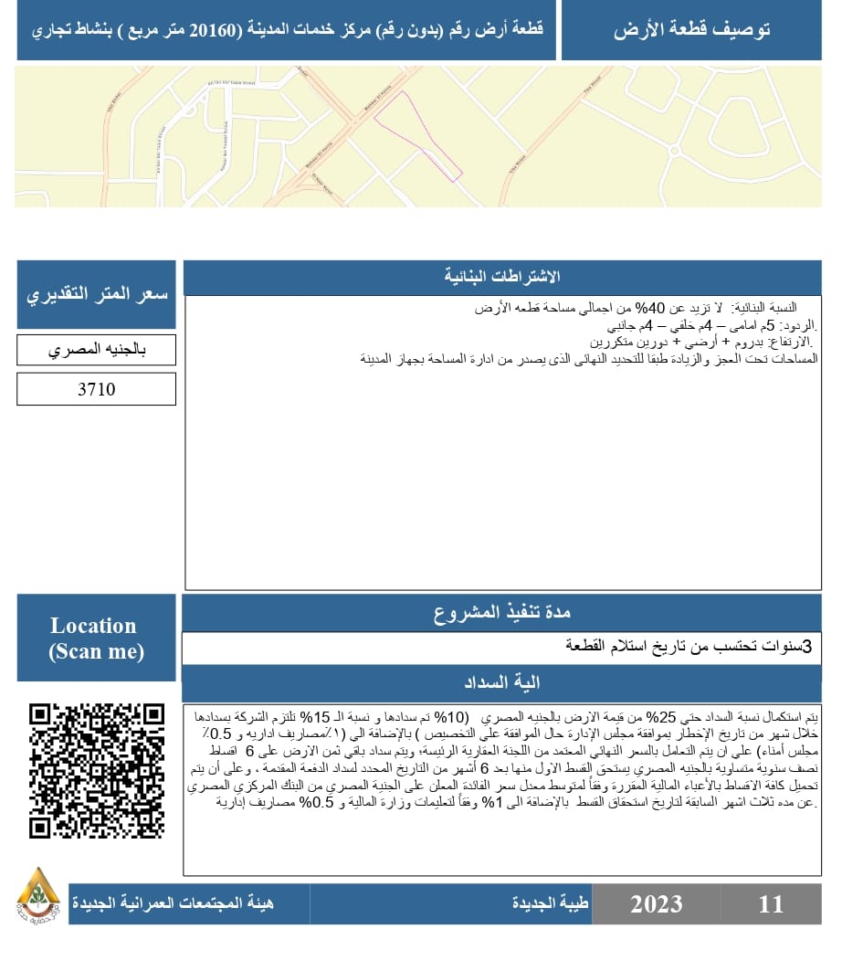 ١- قطعة أرض بنشاط "تجاري" بمساحة ٢٠١٦٠ م٢ بمركز خدمات المدينة.