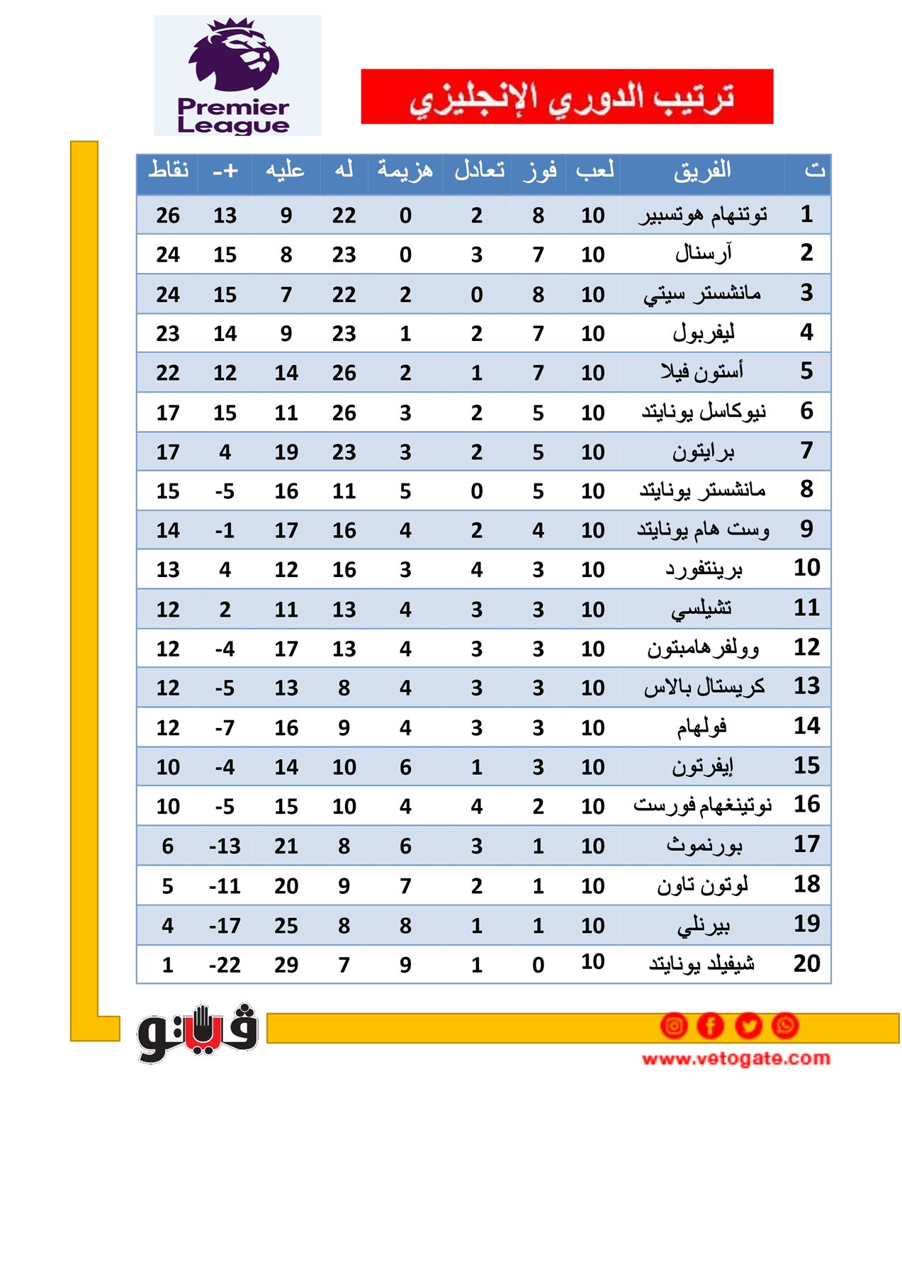 ويتصدر توتنهام ترتيب الدوري الإنجليزي الممتاز برصيد 26 نقطة ويليه أرسنال ومانشستر سيتي برصيد 24 نقطة ثم ليفربول رابعا برصيد 23 نقطة.