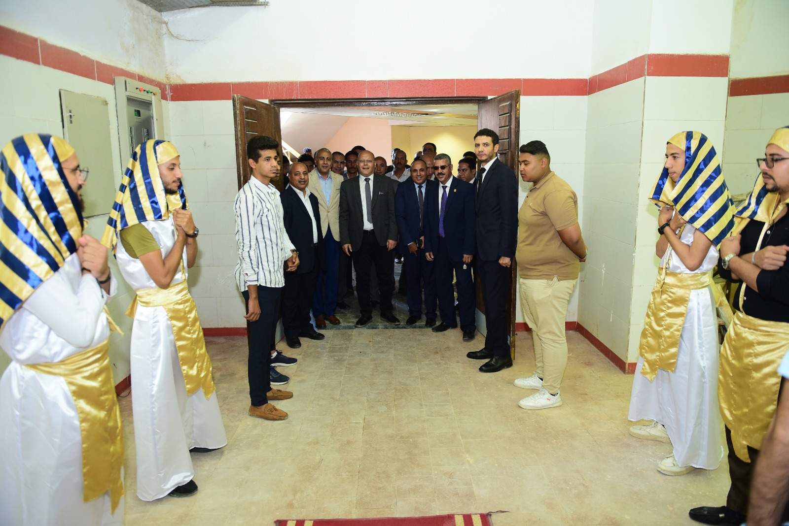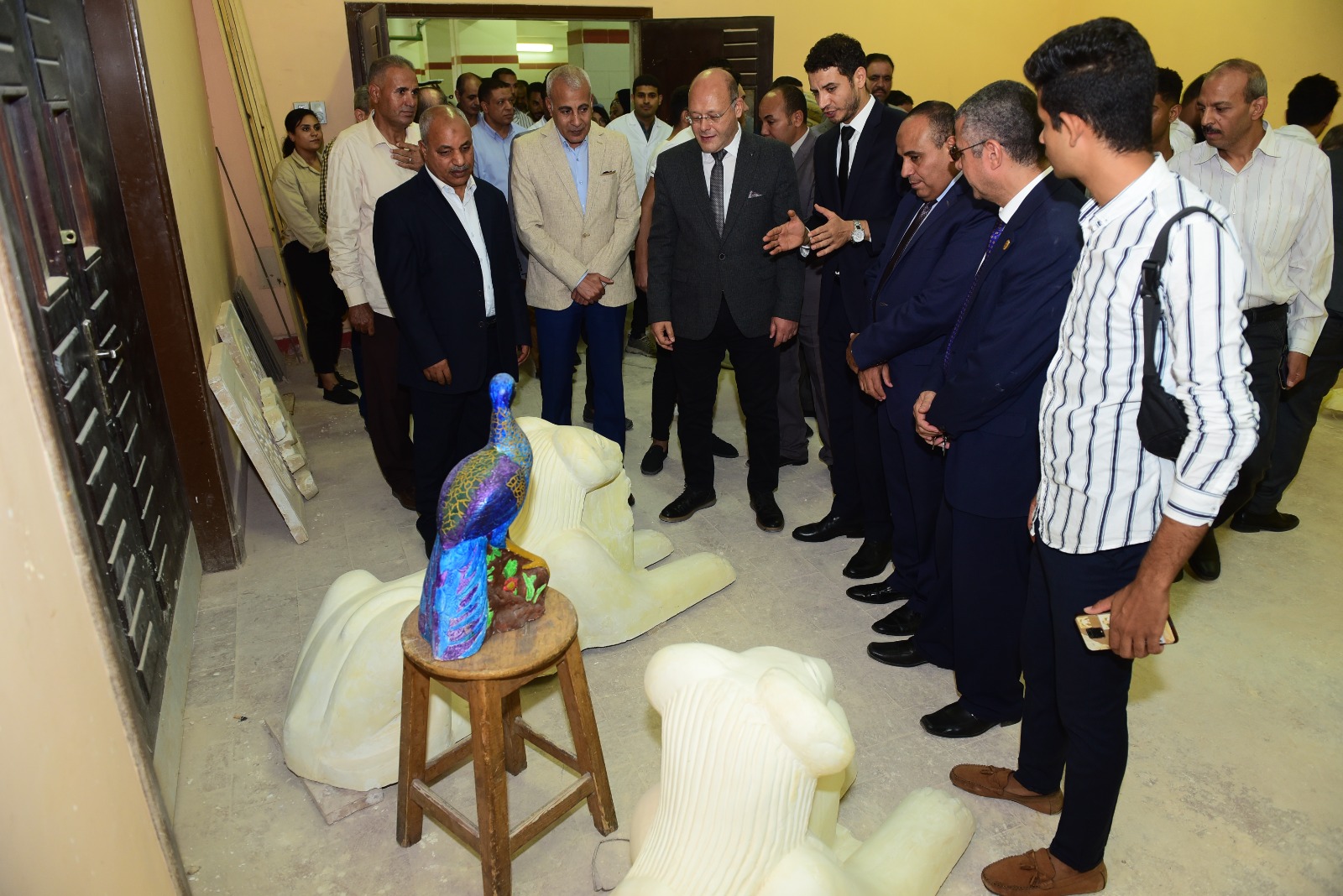 وأوضح الدكتور فهيم حجازي عميد الكلية أن رئيس الجامعة تفقد خلال جولته مجموعة من نماذج لتماثيل الكباش ونماذج لتماثيل ميريت آمون بالمعمل تمت تحت إشراف الدكتور محمد عوض أستاذ الترميم والدكتور محمود أبو الفتوح السيد مدرس الترميم المعماري بالكلية، والدكتور حسام رجب سليم مدرس مساعد بالكلية، والدكتور عبد الناصر علي معيد بقسم الترميم وطلاب الفرقة الثالثة، كما تفقد أيضًا نماذج للوحات جدارية ولوحات زيتية وتماثيل وتابوت ضخم يزن حوالي طن تقريبًا بمدخل الكلية.