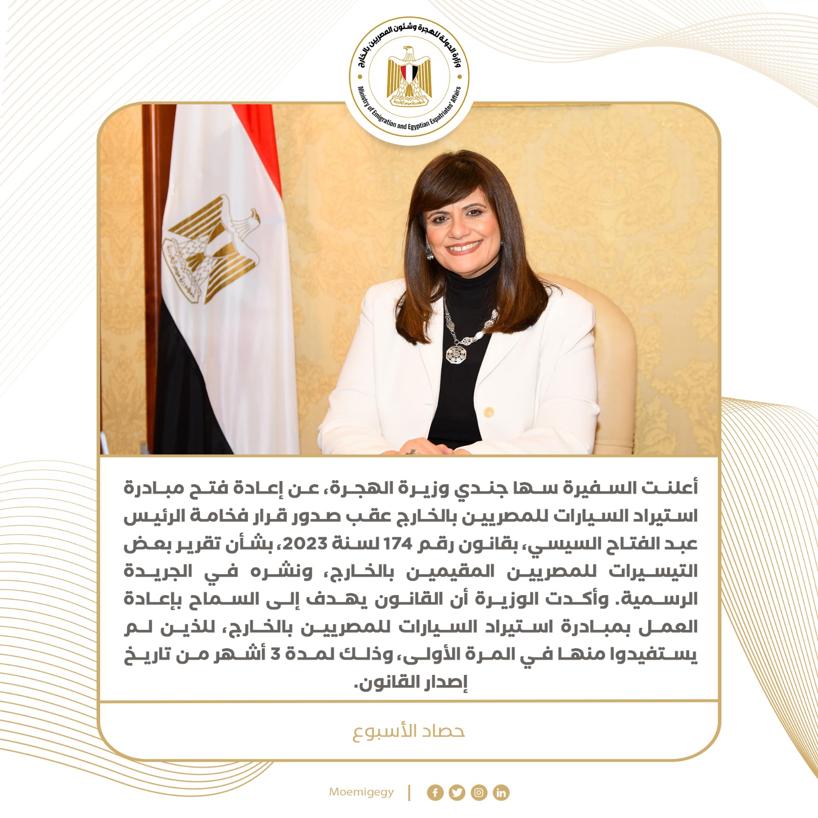 2- أعلنت السفيرة سها جندي وزيرة الهجرة، عن إعادة فتح مبادرة استيراد السيارات للمصريين بالخارج عقب صدور قرار الرئيس عبد الفتاح السيسي، بقانون رقم ١٧٤ لسنة ٢٠٢٣، بشأن تقرير بعض التيسيرات للمصريين المقيمين بالخارج، ونشره في الجريدة الرسمية. وأكدت الوزيرة أن القانون يهدف إلى السماح بإعادة العمل بمبادرة استيراد السيارات للمصريين بالخارج، للذين لم يستفيدوا منها في المرة الأولى، وذلك لمدة 3 أشهر من تاريخ إصدار القانون.