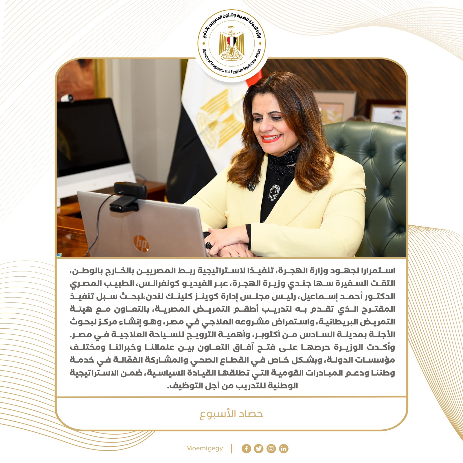9 - استمرارا لجهود وزارة الهجرة، تنفيذا لاستراتيجية ربط المصريين بالخارج بالوطن، التقت السفيرة سها جندي وزيرة الهجرة، عبر الفيديو كونفرانس، الطبيب المصري الدكتور أحمد إسماعيل، رئيس مجلس إدارة كوينز كلينك لندن، لبحث سبل تنفيذ المقترح الذي تقدم به لتدريب أطقم التمريض المصرية، بالتعاون مع هيئة التمريض البريطانية، واستعراض مشروعه العلاجي في مصر وهو إنشاء مركز لبحوث الأجنة بمدينة 6 أكتوبر، وأهمية الترويج للسياحة العلاجية في مصر. وأكدت الوزيرة حرصها على فتح آفاق التعاون بين علمائنا وخبرائنا ومختلف مؤسسات الدولة، وبشكل خاص في القطاع الصحي والمشاركة الفعّالة في خدمة وطننا ودعم المبادرات القومية التي تطلقها القيادة السياسية، ضمن الاستراتيجية الوطنية للتدريب من أجل التوظيف.