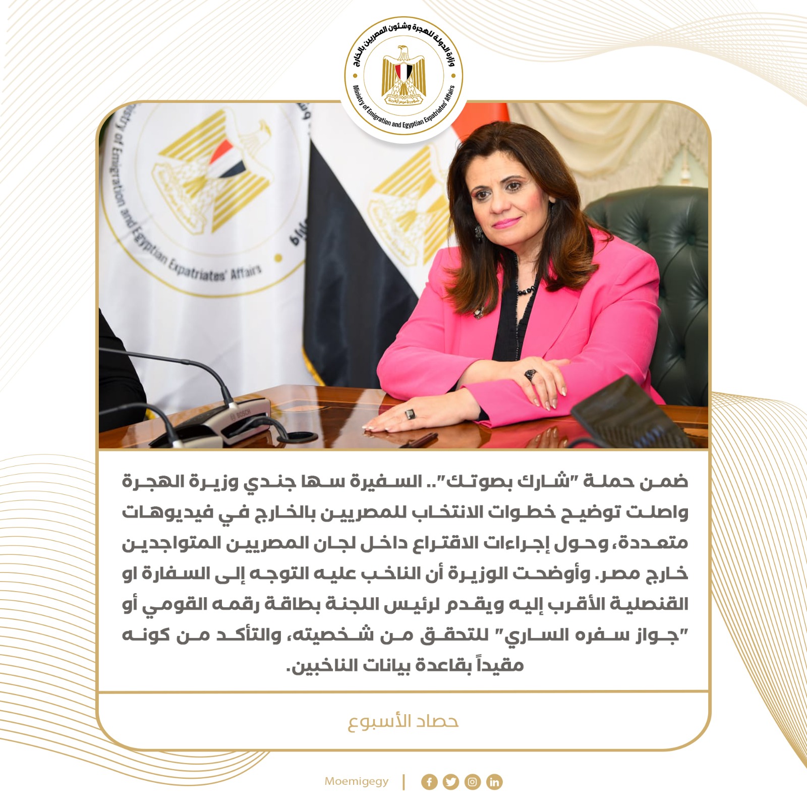 10 - ضمن حملة "شارك بصوتك".. السفيرة سها جندي وزيرة الهجرة واصلت توضيح خطوات الانتخاب للمصريين بالخارج في فيديوهات متعددة، وحول إجراءات الاقتراع داخل لجان المصريين المتواجدين خارج مصر. وأوضحت الوزيرة أن الناخب عليه التوجه إلى السفارة او القنصلية الأقرب إل قربيه ويقدم لرئيس اللجنة بطاقة رقمه القومي أو "جواز سفره الساري" للتحقق من شخصيته، والتأكد من كونه مقيدًا بقاعدة بيانات الناخبين.