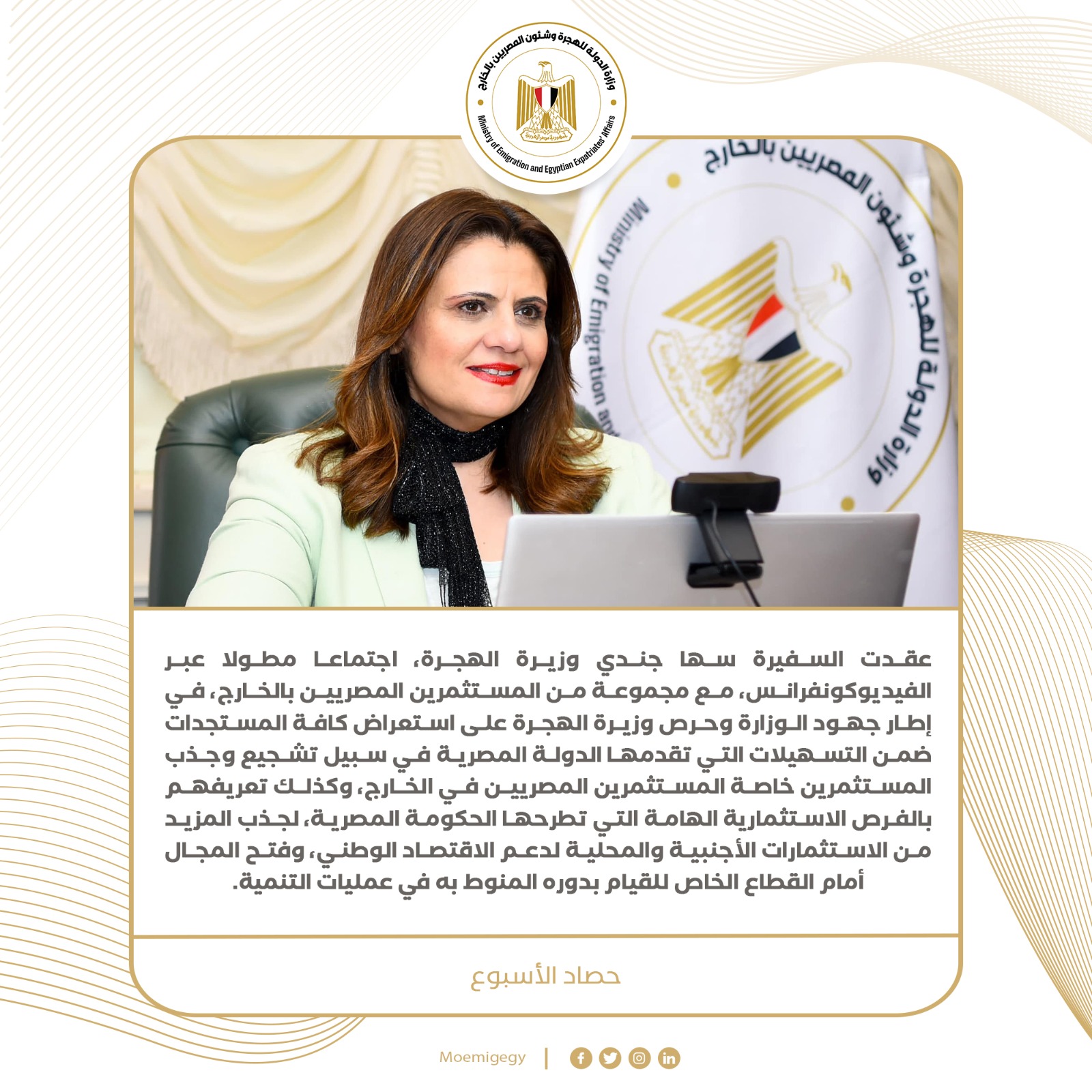 نشرت وزارة الهجرة وشؤون المصريين بالخارج حصاد الوزارة خلال الأسبوع الماضي والذي شهد عددا من الفاعليات والأنشطة والتي تضمنت ما يلي:
