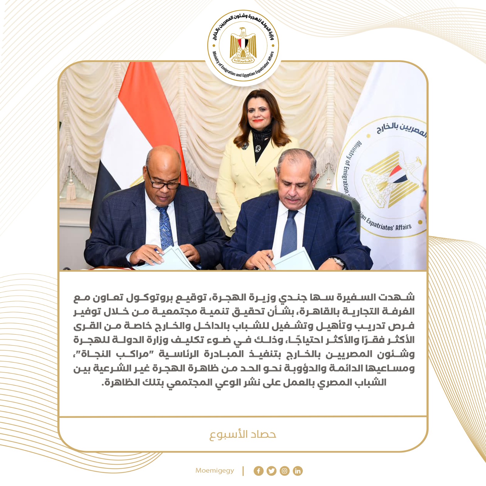6 - شهدت السفيرة سها جندي وزيرة الهجرة، توقيع بروتوكول تعاون مع الغرفة التجارية بالقاهرة، بشأن تحقيق تنمية مجتمعية من خلال توفير فرص تدريب وتأهيل وتشغيل للشباب بالداخل والخارج خاصة من القرى الأكثر فقرًا والأكثر احتياجًا، وذلك في ضوء تكليف وزارة الدولة للهجرة وشئون المصريين بالخارج بتنفيذ المبادرة الرئاسية "مراكب النجاة"، ومساعيها الدائمة والدؤوبة نحو الحد من ظاهرة الهجرة غير الشرعية بين الشباب المصري بالعمل على نشر الوعي المجتمعي بتلك الظاهرة.