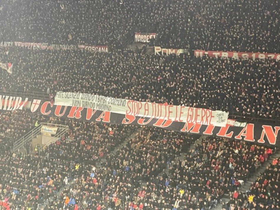 ورفعت جماهير ميلان لافتة خلال مواجهة أودينيزي في الدوري الإيطالي، مكتوب عليها: "اصمتوا عندما ينام الأطفال وليس عندما يموتون.. أوقفوا كل الحروب".