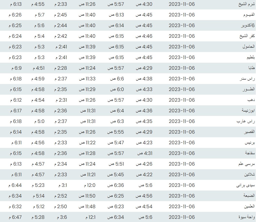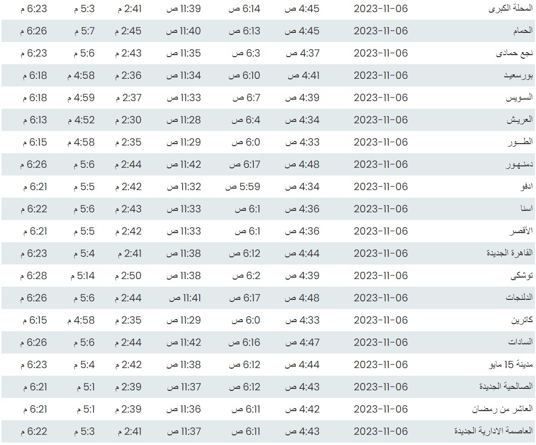 مواقيت الصلاة اليوم وفقًا للتوقيت المحلي لمدينتي القاهرة والإسكندرية وكذلك، مواقيت الصلاة، لعدد من مدن ومحافظات الجمهورية من واقع بيانات الهيئة العامة للمساحة