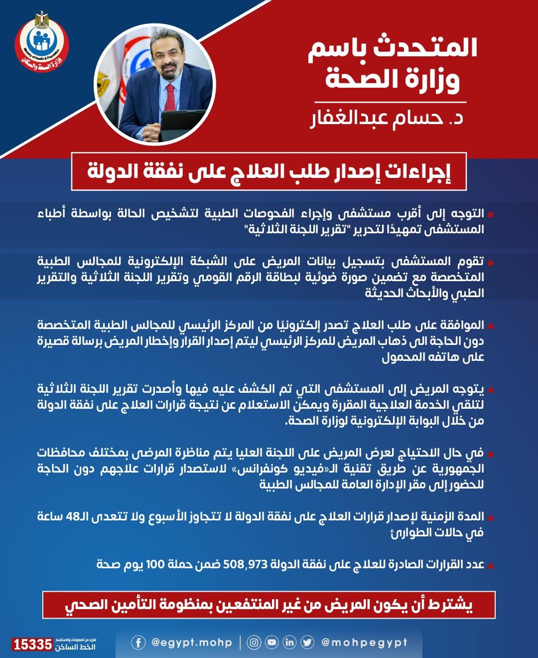 وفي سياق متصل كشف الدكتور حسام عبد الغفار المتحدث الرسمي لوزارة الصحة عن المدة الزمنية لإصدار قرارات العلاج على نفقة الدولة مشيرا إلى أنها لا تتجاوز الأسبوع.