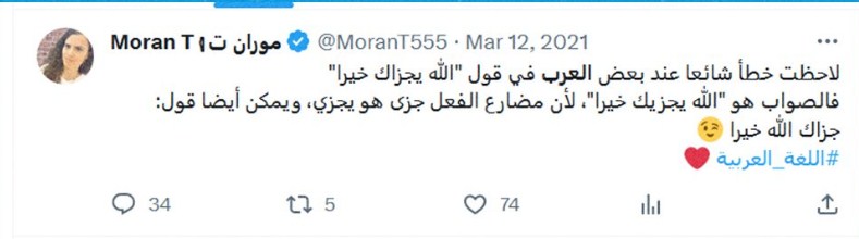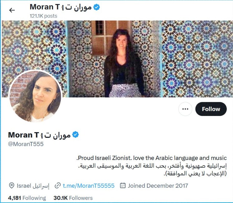 تعرف موران تي نفسها على كل موقع بشكل مختلف، فعلى تويتر تذكر أنها إسرائيلية صهيونية، محبة للموسيقى العربية، للفلكلور التراثي والأغاني الطربية، وبتصفح حسابها تجد أنها تجيد وبإتقان اللغة العربية، بل وحتى الإعراب، لكن كل ذلك لم يكن إلا صورة أولية عنها، حسبما كشفت "إيكاد"
