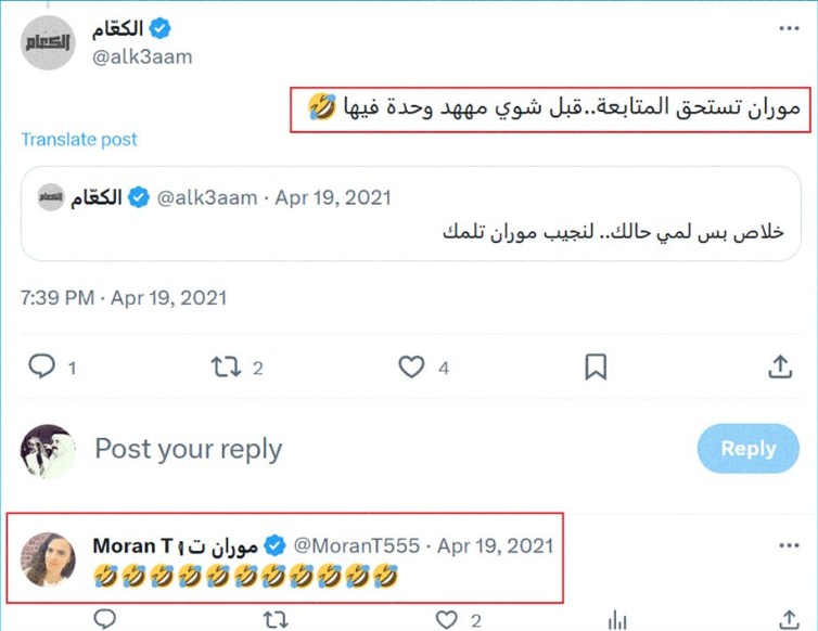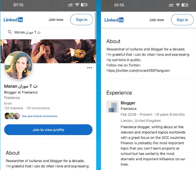 أما مورات تي 555 فقد كشف حسابها على "لينكد إن"، أنها مدونة من إسرائيل، باحثة في الثقافات العربية منذ فترة طويلة، ومختصة بشكل دقيق في دول الخليج، لكن الأخطر والذي تم الكشف عنه من خلال منصة الاستخبارات المفتوحة، فالفتاة الإسرائيلية "موران تي" تنتمي لأحد الأكاديميات الإسرائيلية المخصصة في تدريس اللغة العربية، وكان هناك منشور لها أواخر ٢٠١٦، يثبت أن موران تعمل مدرسة للغة العربية، في أكاديمية تعمل على تأهيل الشباب اليهودي على العمل في الاستخبارات والقطاع العسكري بسلطة الاحتلال.